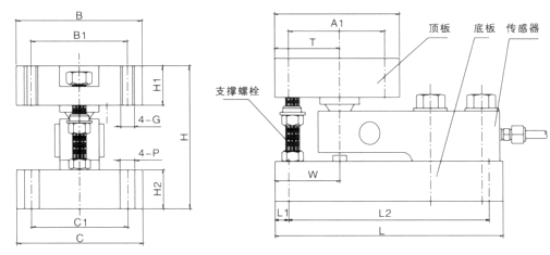模塊由頂板、底板、剪切梁稱重傳感器、傳感器承壓頭及支撐螺栓等部件構(gòu)成:在稱重時(shí),載荷作用于頂板,通過傳感器承壓頭施加到傳感器上,根據(jù)不同組裝方式可以分成三種類型:固定式模塊、半浮動(dòng)式模塊和全浮動(dòng)式模塊。這三種類型的模塊組合在一起可以消除因容器受力變形或熱脹冷縮而